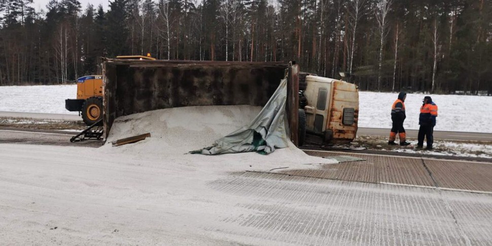 Грузовик с солью опрокинулся на трассе в Минской области